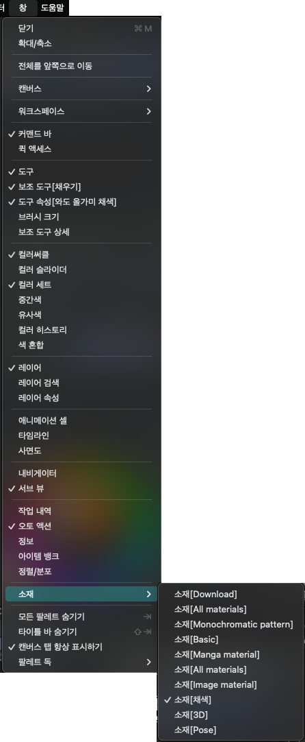 1. 클립스튜디오 맨 위 메뉴바에서 '표시 - 소재 - 아무 섹션이나' 클릭